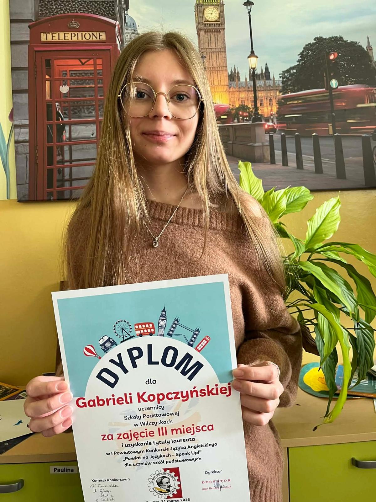 Uczennica Szkoły Podstawowej w Wilczyskach Gabriela Kopczyńska (klasa VIII) została laureatką I Powiatowego Konkursu Języka Angielskiego „Powiat na Językach – Speak up”. Gabriela zdobyła III miejsce. Rywalizacja była na bardzo wysokim poziomie. Konkurs składał się z dwóch części: pierwsza – zadania gramatyczne, leksykalne i kulturowe; druga – słuchanie i wypracowanie. Gratulujemy sukcesu.