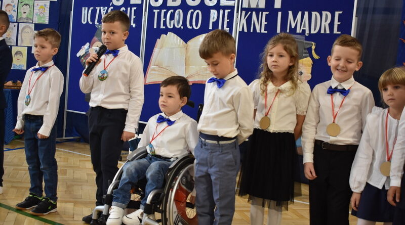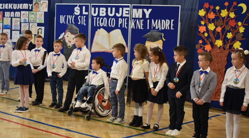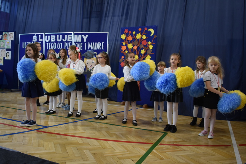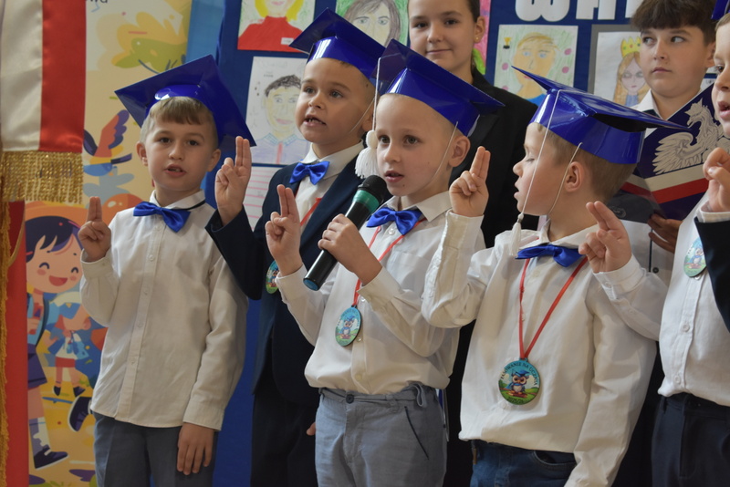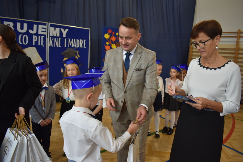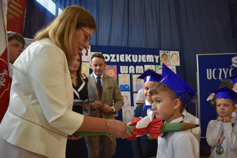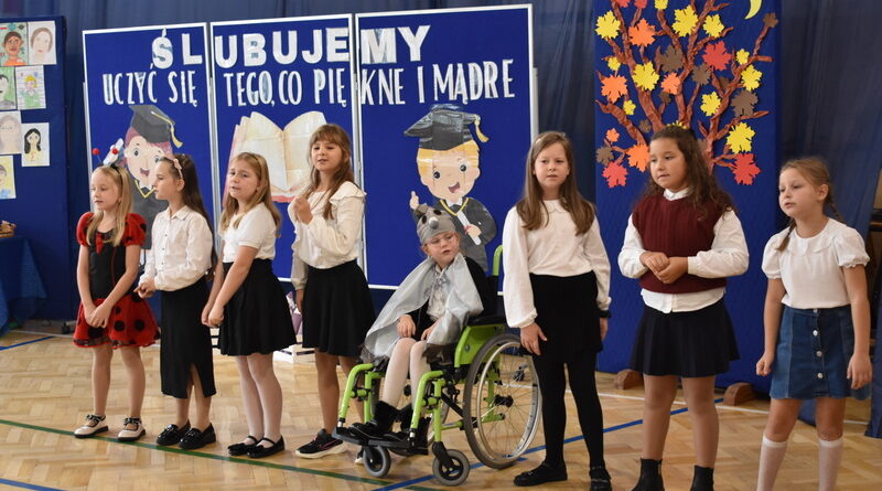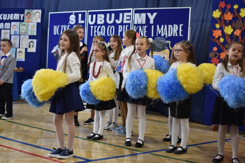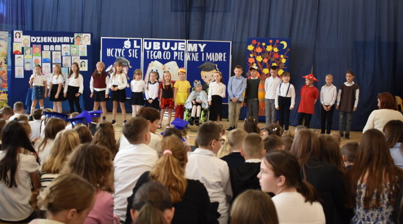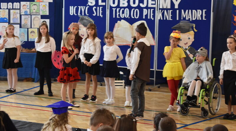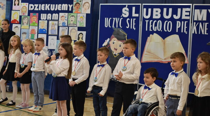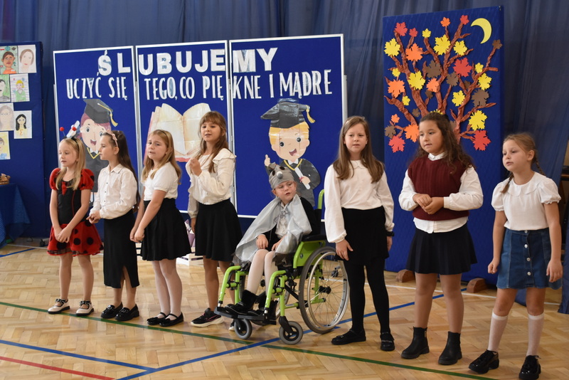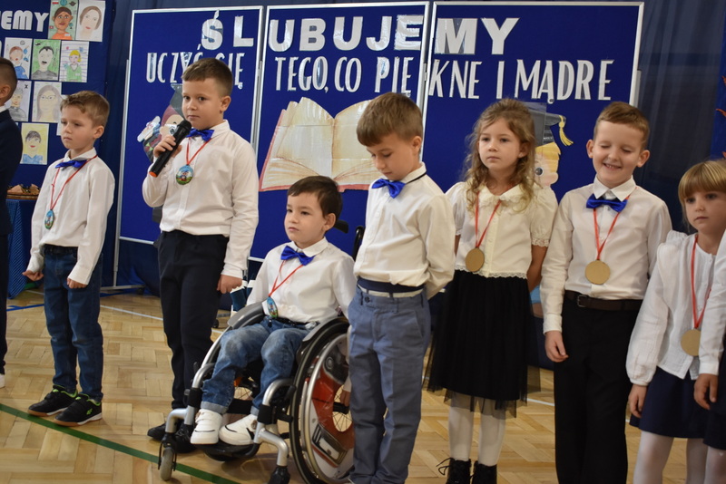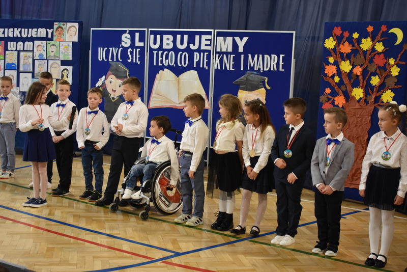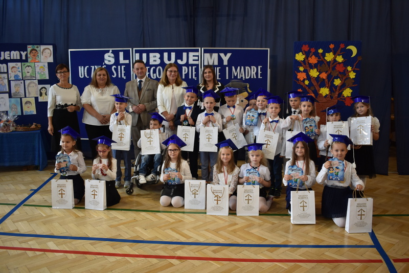 14 października 2025 roku w naszej szkole odbyła się niezwykle ważna uroczystość – ślubowania i pasowania uczniów klasy pierwszej. Mimo stresu związanego z pierwszym publicznym występem, dzieci doskonale sobie poradziły, prezentując wszystkim urozmaicony i ciekawy występ artystyczny. Udowodniły, że są gotowe, aby stać się stuprocentowymi uczniami.Pasowanie to jedno z najważniejszych wydarzeń w szkolnym życiu pierwszoklasisty. Od tego dnia każde dziecko czuje się już prawdziwym uczniem, czyli pełnoprawnym członkiem szkolnej rodziny. Uczniowie klasy pierwszej ślubowali być godnymi Polakami i wzorowymi uczniami. W ten sposób oficjalnie przyjęci zostali do grona uczniów naszej szkoły. Największym przeżyciem dla dzieci był moment pasowania. Pani Dyrektor poprzez dotknięcie ogromnym ołówkiem ramienia każdego dziecka zamieniała go w prawdziwego ucznia. Następnie Pan Burmistrz Marcin Wąs osobiście pogratulował i wręczył upominki każdemu pierwszoklasiście. Potem uczniowie klasy drugiej zaprezentowali swoim młodszym kolegom i koleżankom dobre rady wierszem mówione.