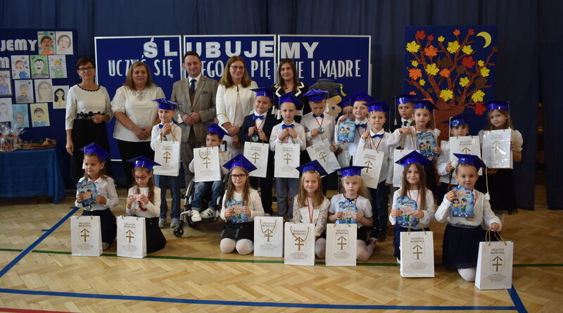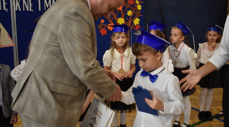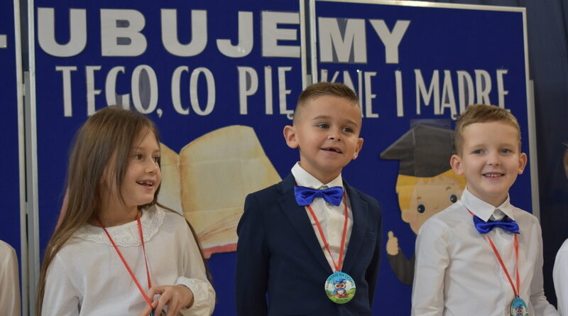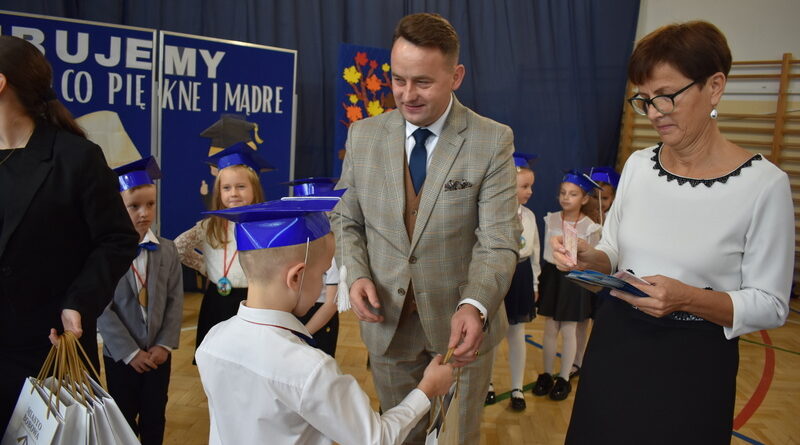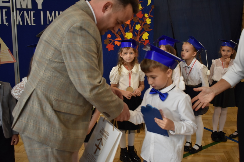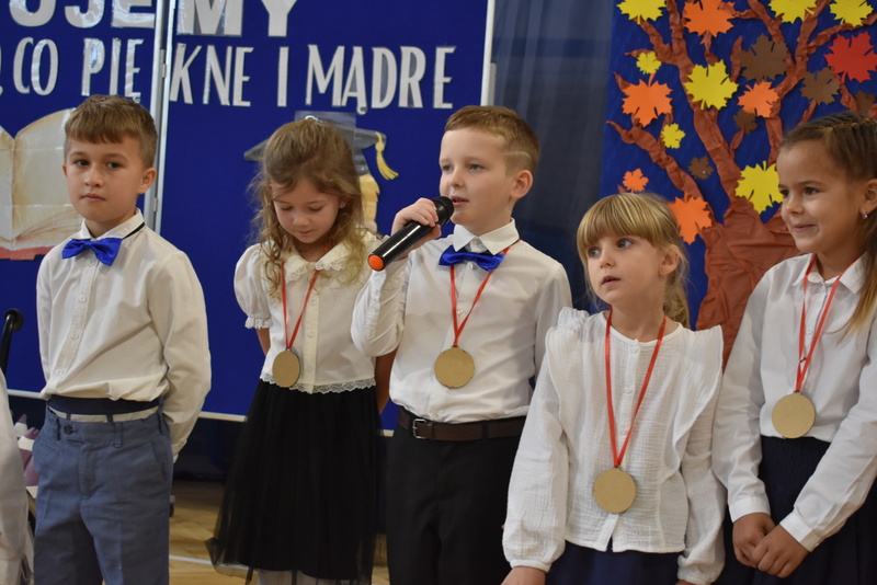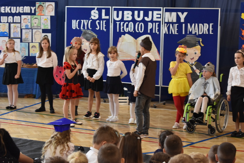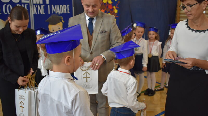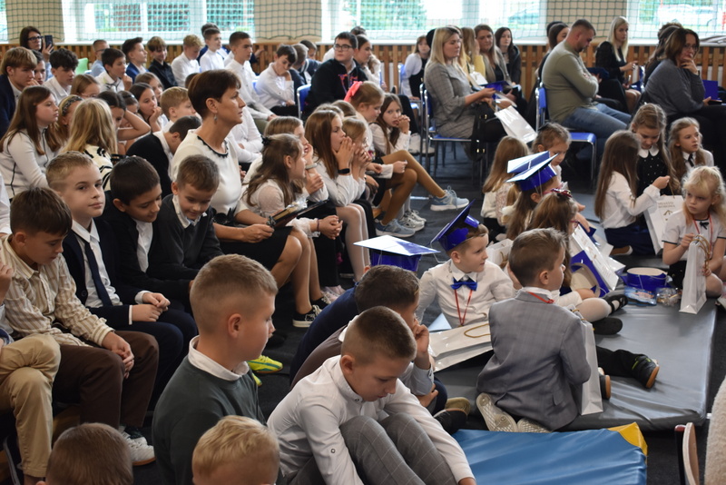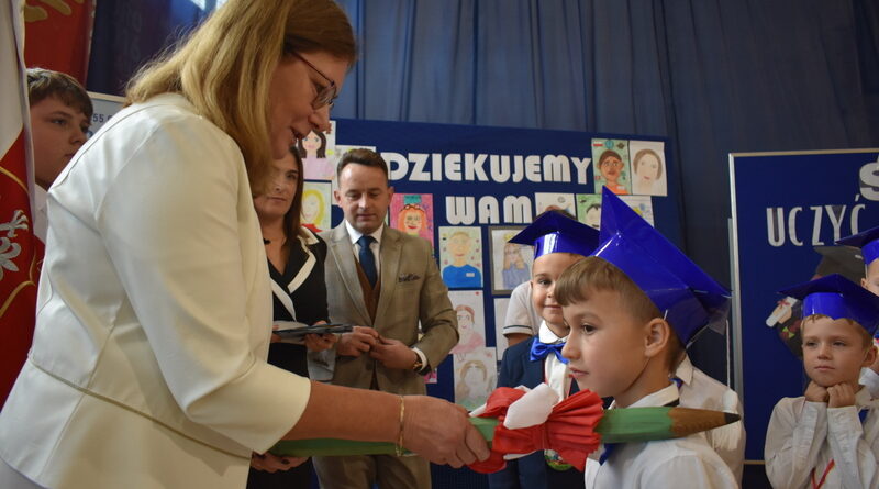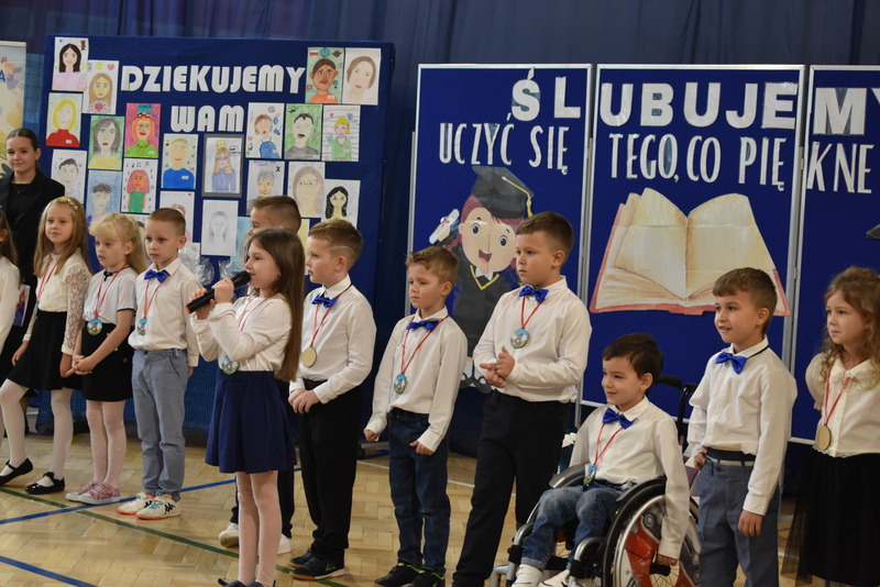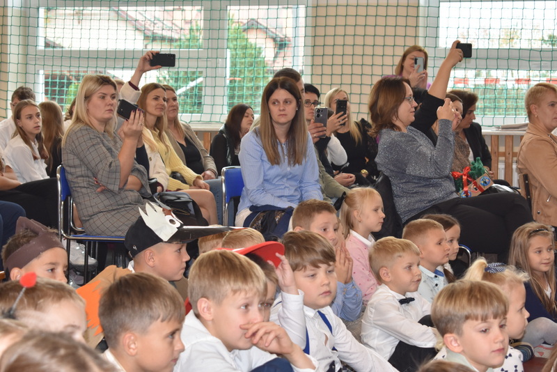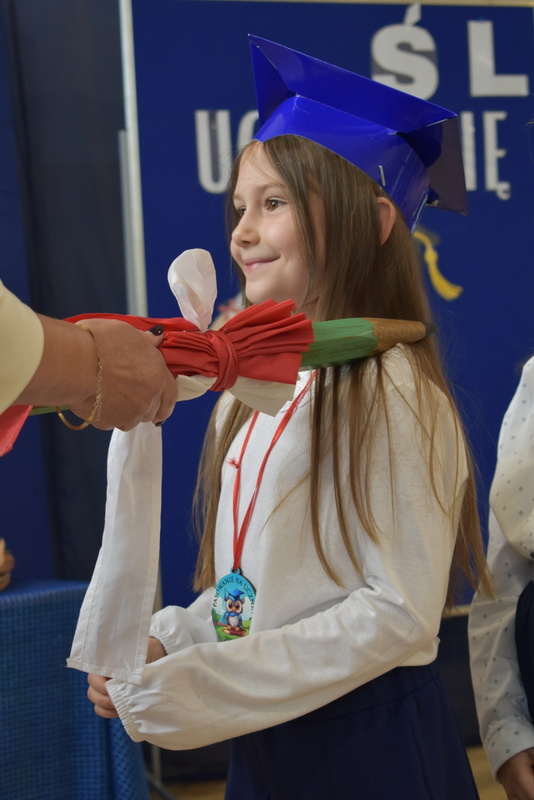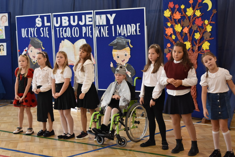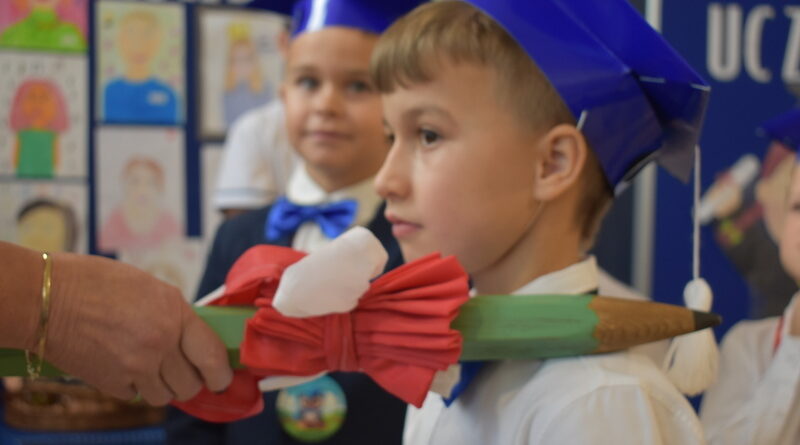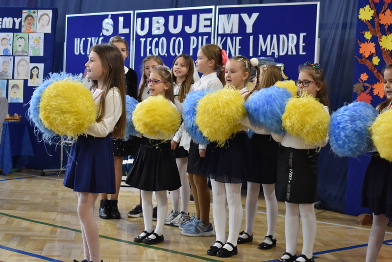 14 października 2025 roku w naszej szkole odbyła się niezwykle ważna uroczystość – ślubowania i pasowania uczniów klasy pierwszej. Mimo stresu związanego z pierwszym publicznym występem, dzieci doskonale sobie poradziły, prezentując wszystkim urozmaicony i ciekawy występ artystyczny. Udowodniły, że są gotowe, aby stać się stuprocentowymi uczniami.Pasowanie to jedno z najważniejszych wydarzeń w szkolnym życiu pierwszoklasisty. Od tego dnia każde dziecko czuje się już prawdziwym uczniem, czyli pełnoprawnym członkiem szkolnej rodziny. Uczniowie klasy pierwszej ślubowali być godnymi Polakami i wzorowymi uczniami. W ten sposób oficjalnie przyjęci zostali do grona uczniów naszej szkoły. Największym przeżyciem dla dzieci był moment pasowania. Pani Dyrektor poprzez dotknięcie ogromnym ołówkiem ramienia każdego dziecka zamieniała go w prawdziwego ucznia. Następnie Pan Burmistrz Marcin Wąs osobiście pogratulował i wręczył upominki każdemu pierwszoklasiście. Potem uczniowie klasy drugiej zaprezentowali swoim młodszym kolegom i koleżankom dobre rady wierszem mówione.