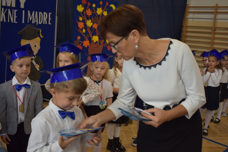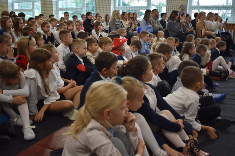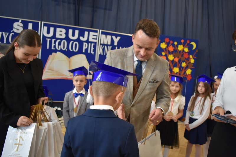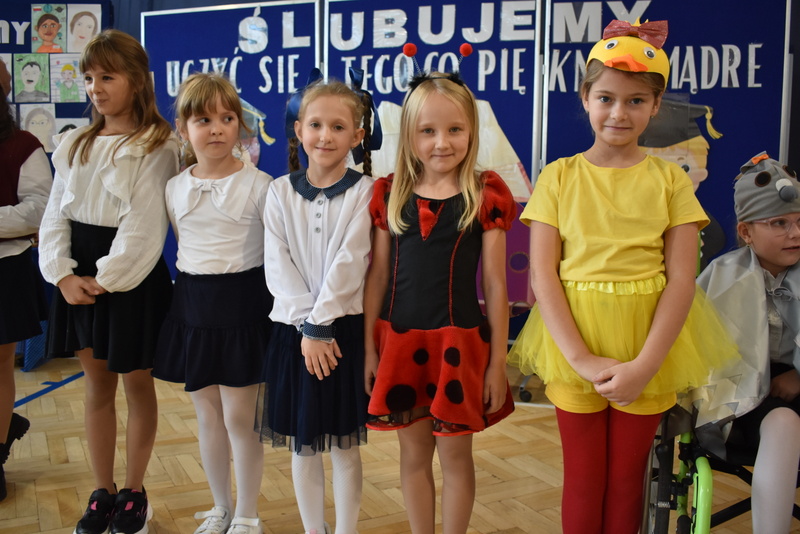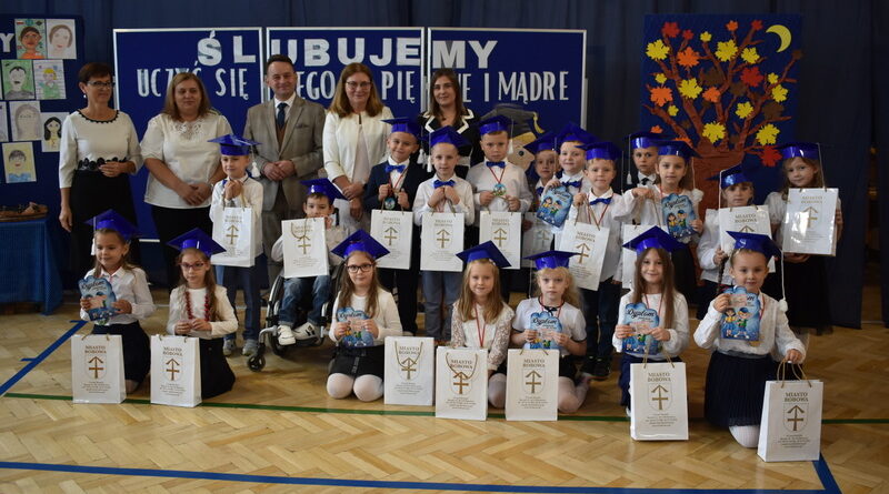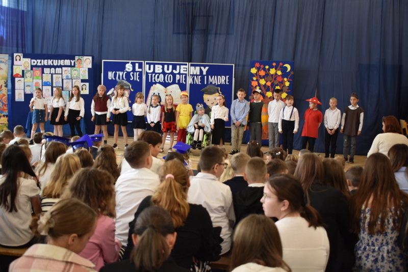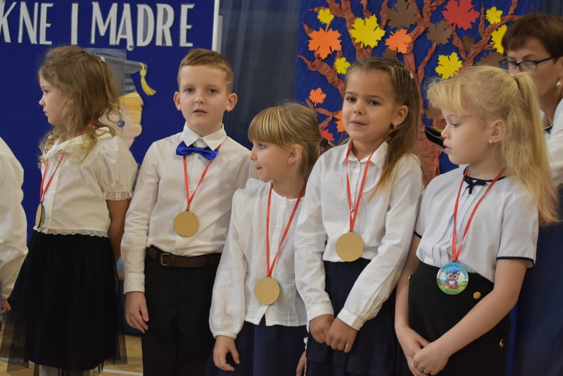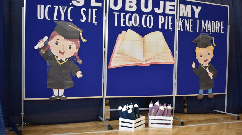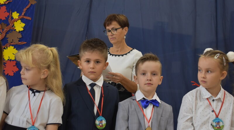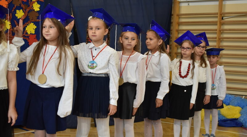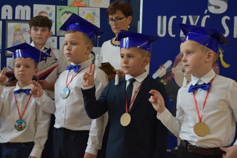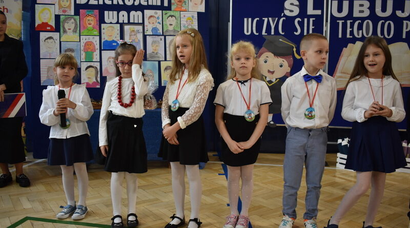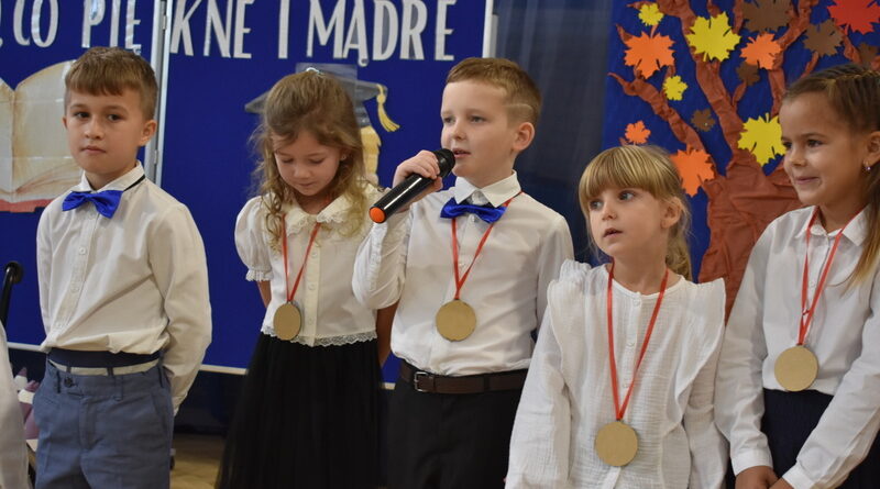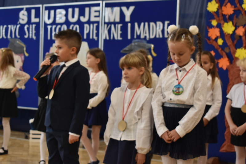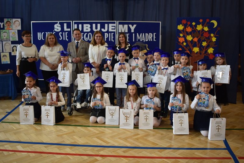 14 października 2025 roku w naszej szkole odbyła się niezwykle ważna uroczystość – ślubowania i pasowania uczniów klasy pierwszej. Mimo stresu związanego z pierwszym publicznym występem, dzieci doskonale sobie poradziły, prezentując wszystkim urozmaicony i ciekawy występ artystyczny. Udowodniły, że są gotowe, aby stać się stuprocentowymi uczniami.Pasowanie to jedno z najważniejszych wydarzeń w szkolnym życiu pierwszoklasisty. Od tego dnia każde dziecko czuje się już prawdziwym uczniem, czyli pełnoprawnym członkiem szkolnej rodziny. Uczniowie klasy pierwszej ślubowali być godnymi Polakami i wzorowymi uczniami. W ten sposób oficjalnie przyjęci zostali do grona uczniów naszej szkoły. Największym przeżyciem dla dzieci był moment pasowania. Pani Dyrektor poprzez dotknięcie ogromnym ołówkiem ramienia każdego dziecka zamieniała go w prawdziwego ucznia. Następnie Pan Burmistrz Marcin Wąs osobiście pogratulował i wręczył upominki każdemu pierwszoklasiście. Potem uczniowie klasy drugiej zaprezentowali swoim młodszym kolegom i koleżankom dobre rady wierszem mówione.