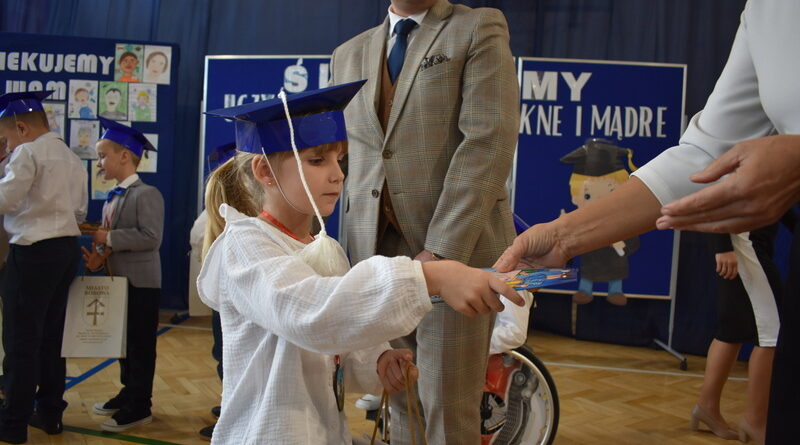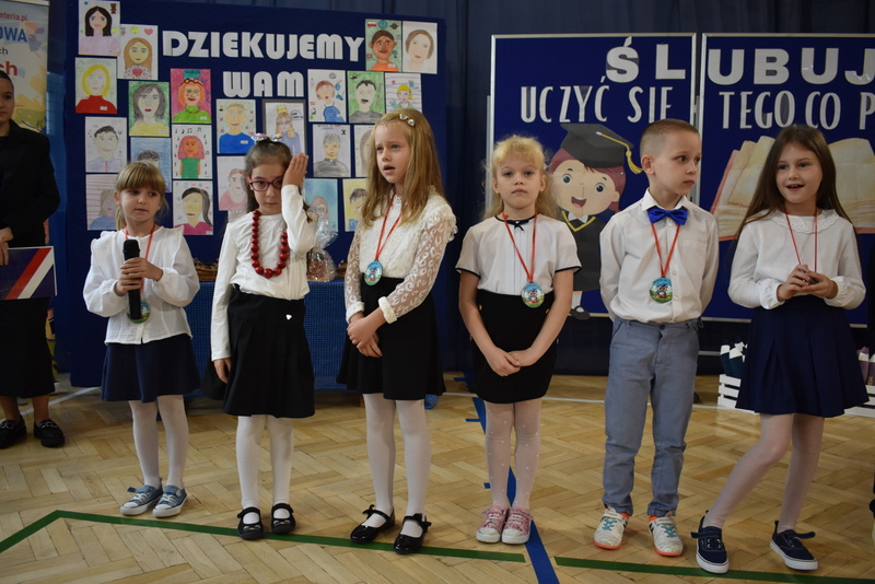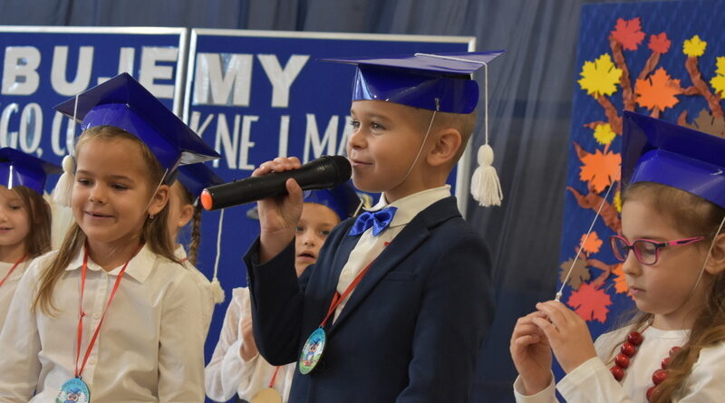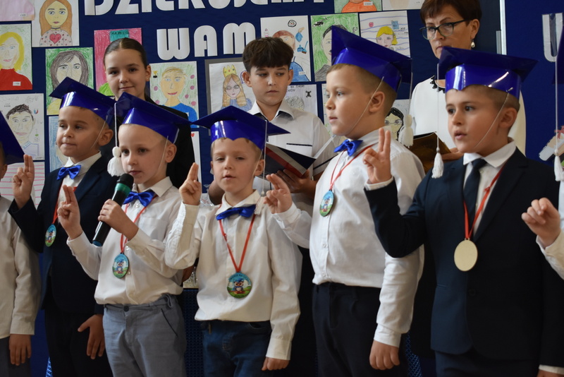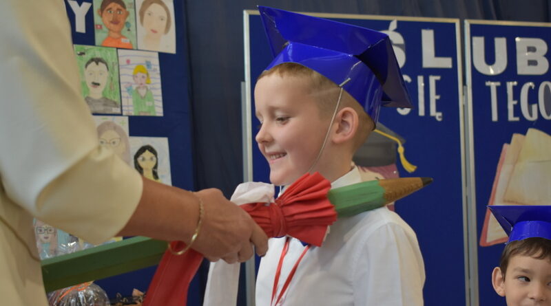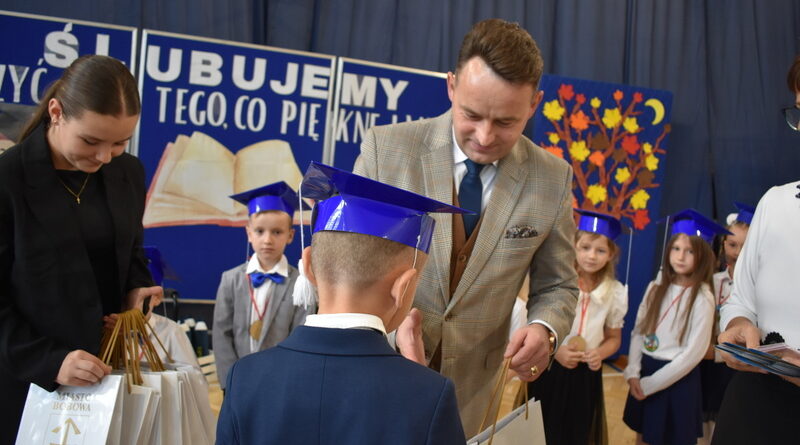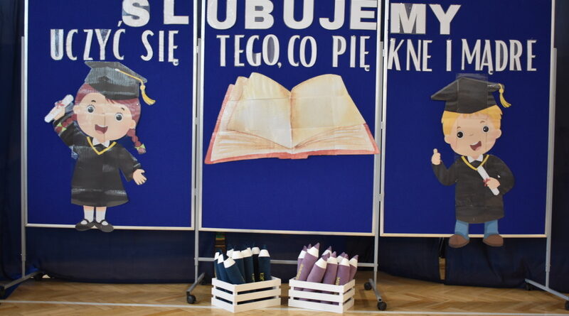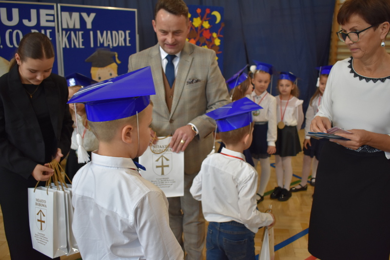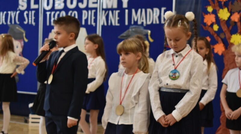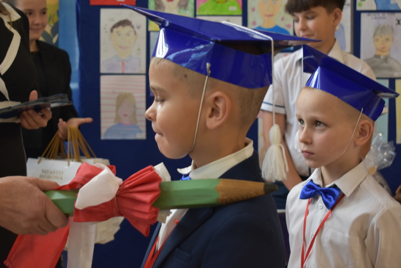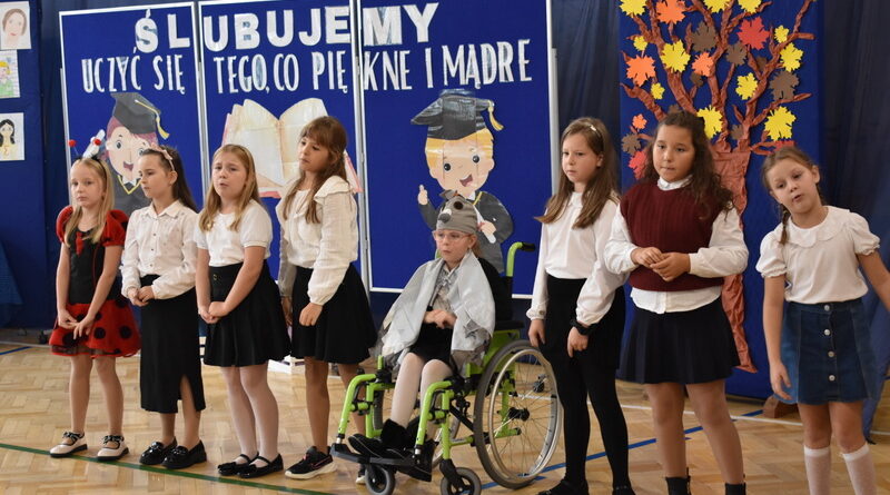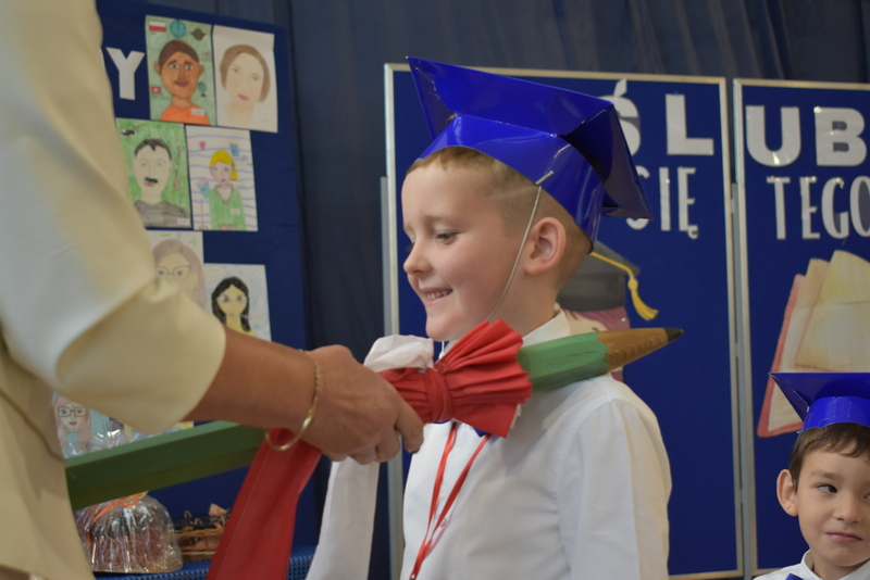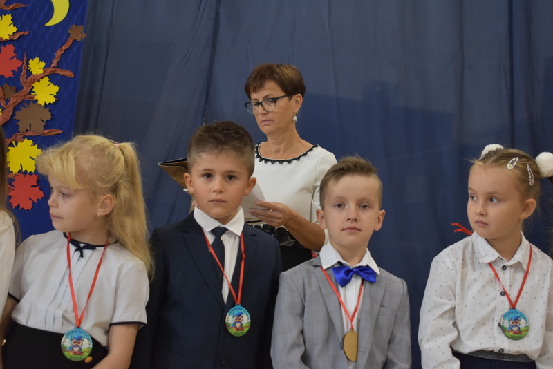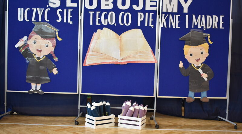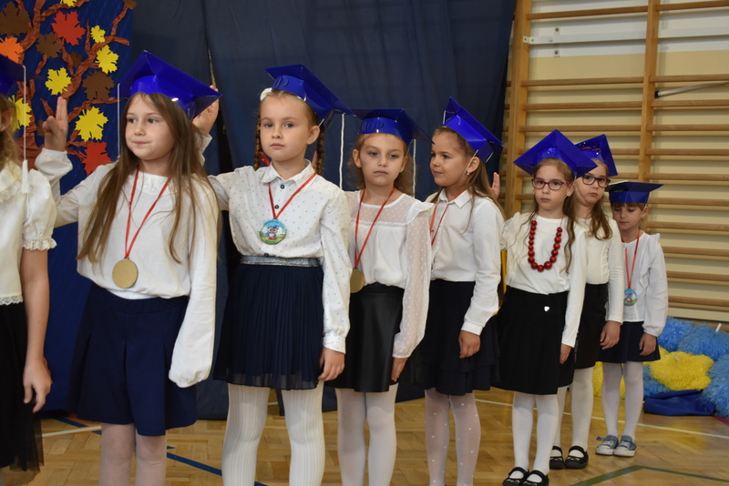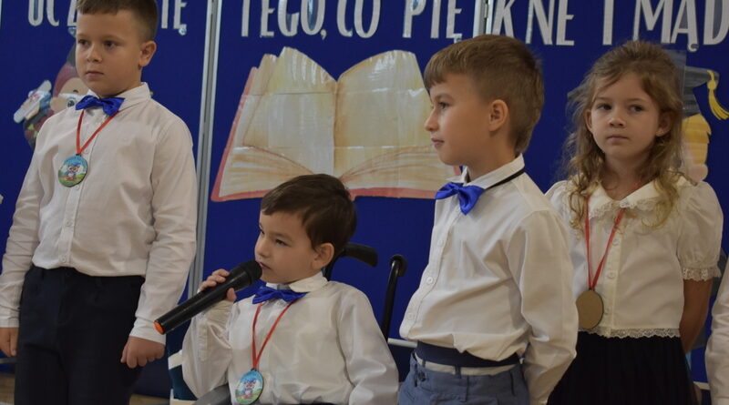14 października 2025 roku w naszej szkole odbyła się niezwykle ważna uroczystość – ślubowania i pasowania uczniów klasy pierwszej. Mimo stresu związanego z pierwszym publicznym występem, dzieci doskonale sobie poradziły, prezentując wszystkim urozmaicony i ciekawy występ artystyczny. Udowodniły, że są gotowe, aby stać się stuprocentowymi uczniami.Pasowanie to jedno z najważniejszych wydarzeń w szkolnym życiu pierwszoklasisty. Od tego dnia każde dziecko czuje się już prawdziwym uczniem, czyli pełnoprawnym członkiem szkolnej rodziny. Uczniowie klasy pierwszej ślubowali być godnymi Polakami i wzorowymi uczniami. W ten sposób oficjalnie przyjęci zostali do grona uczniów naszej szkoły. Największym przeżyciem dla dzieci był moment pasowania. Pani Dyrektor poprzez dotknięcie ogromnym ołówkiem ramienia każdego dziecka zamieniała go w prawdziwego ucznia. Następnie Pan Burmistrz Marcin Wąs osobiście pogratulował i wręczył upominki każdemu pierwszoklasiście. Potem uczniowie klasy drugiej zaprezentowali swoim młodszym kolegom i koleżankom dobre rady wierszem mówione.