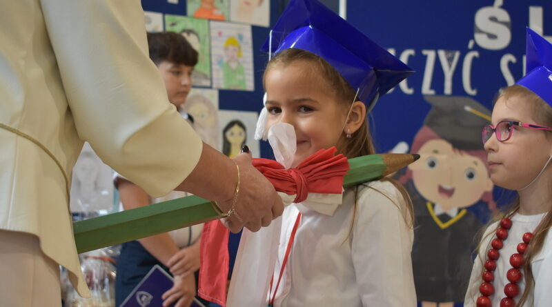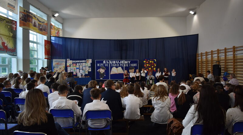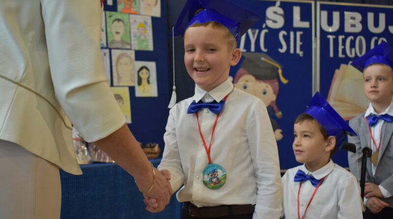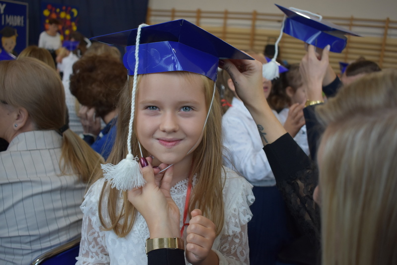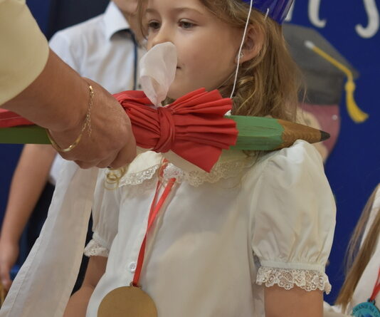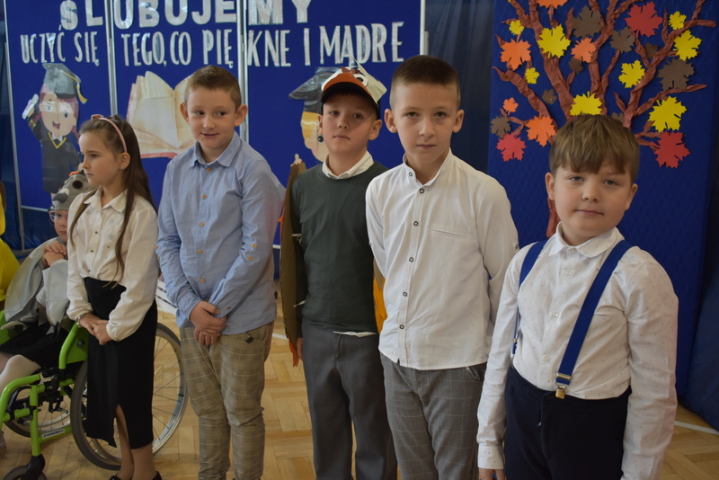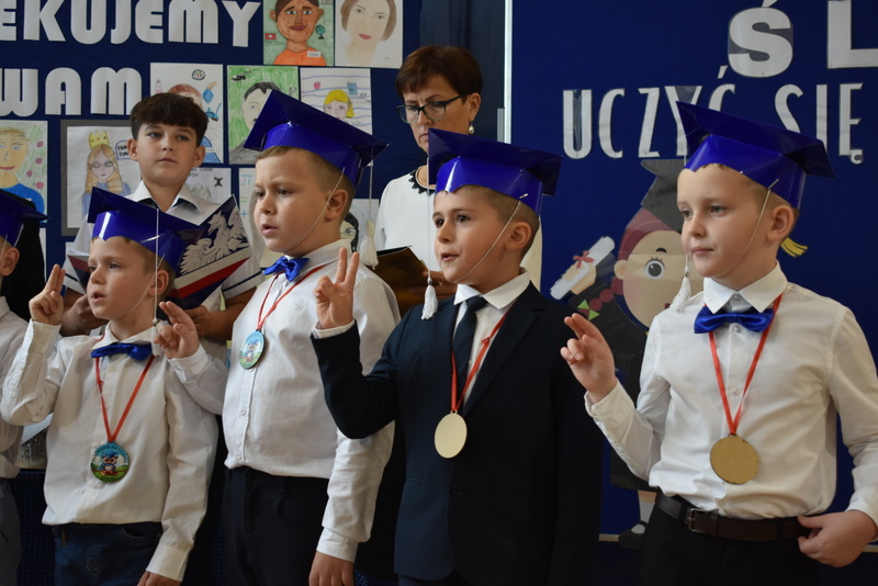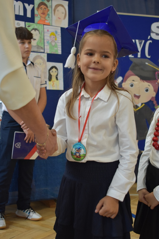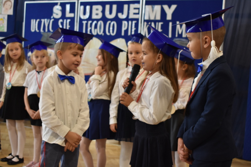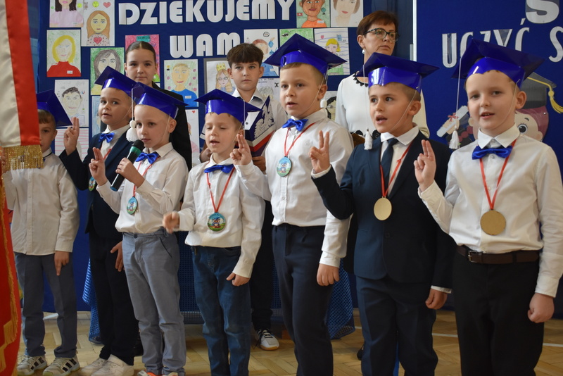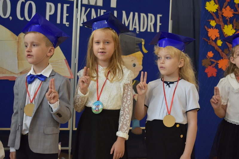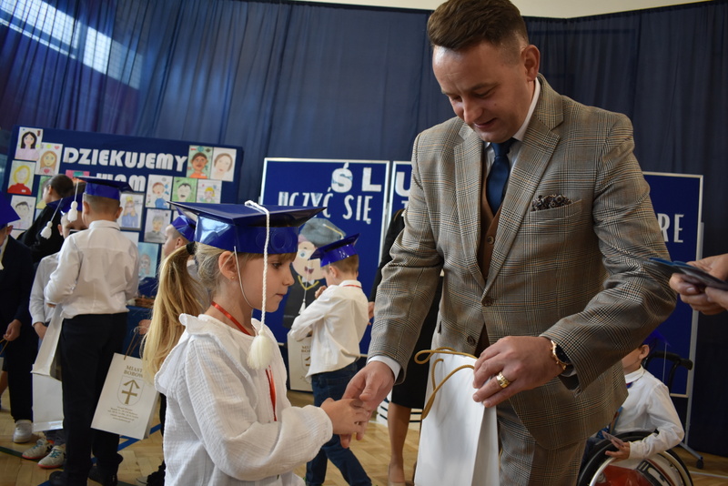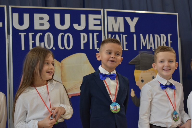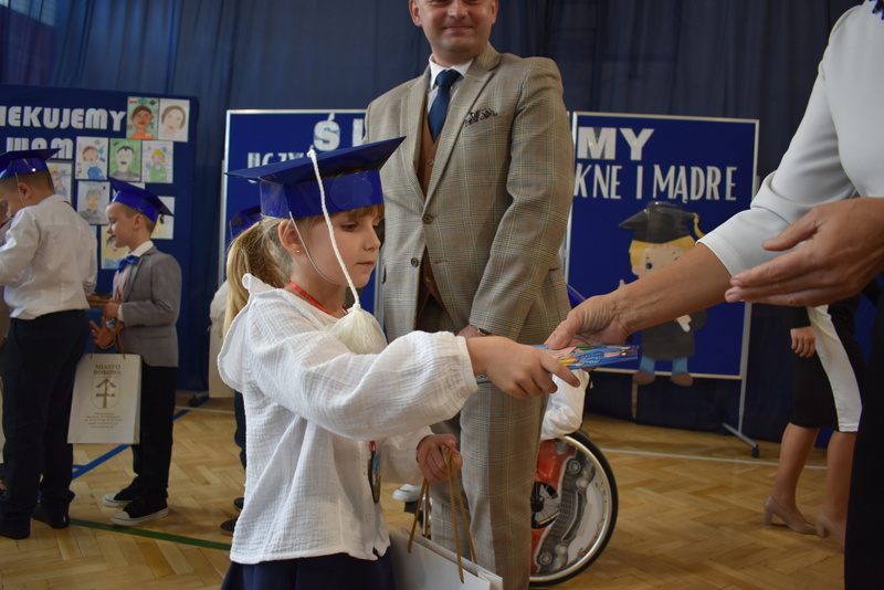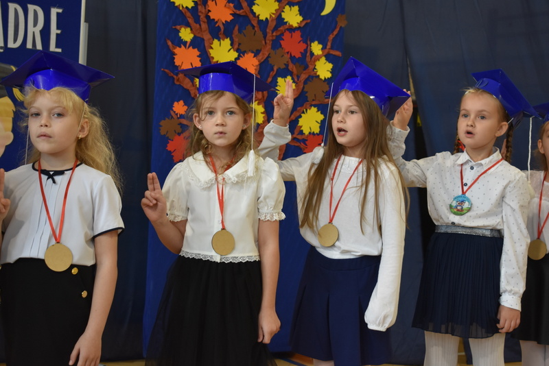 14 października 2025 roku w naszej szkole odbyła się niezwykle ważna uroczystość – ślubowania i pasowania uczniów klasy pierwszej. Mimo stresu związanego z pierwszym publicznym występem, dzieci doskonale sobie poradziły, prezentując wszystkim urozmaicony i ciekawy występ artystyczny. Udowodniły, że są gotowe, aby stać się stuprocentowymi uczniami.Pasowanie to jedno z najważniejszych wydarzeń w szkolnym życiu pierwszoklasisty. Od tego dnia każde dziecko czuje się już prawdziwym uczniem, czyli pełnoprawnym członkiem szkolnej rodziny. Uczniowie klasy pierwszej ślubowali być godnymi Polakami i wzorowymi uczniami. W ten sposób oficjalnie przyjęci zostali do grona uczniów naszej szkoły. Największym przeżyciem dla dzieci był moment pasowania. Pani Dyrektor poprzez dotknięcie ogromnym ołówkiem ramienia każdego dziecka zamieniała go w prawdziwego ucznia. Następnie Pan Burmistrz Marcin Wąs osobiście pogratulował i wręczył upominki każdemu pierwszoklasiście. Potem uczniowie klasy drugiej zaprezentowali swoim młodszym kolegom i koleżankom dobre rady wierszem mówione.