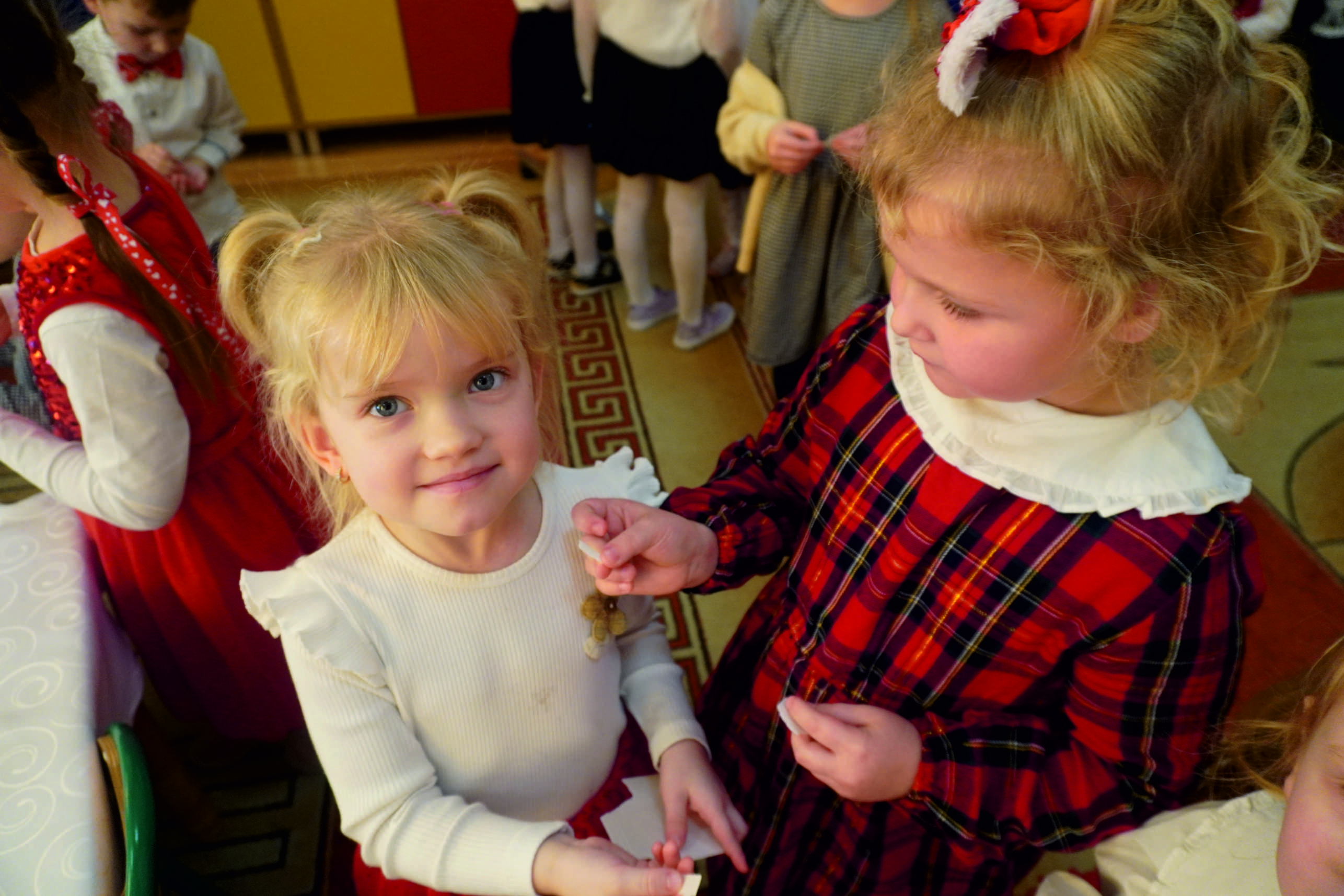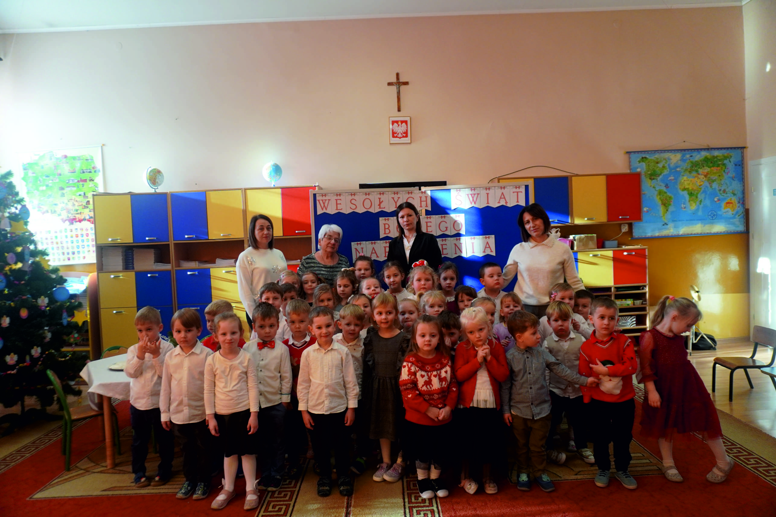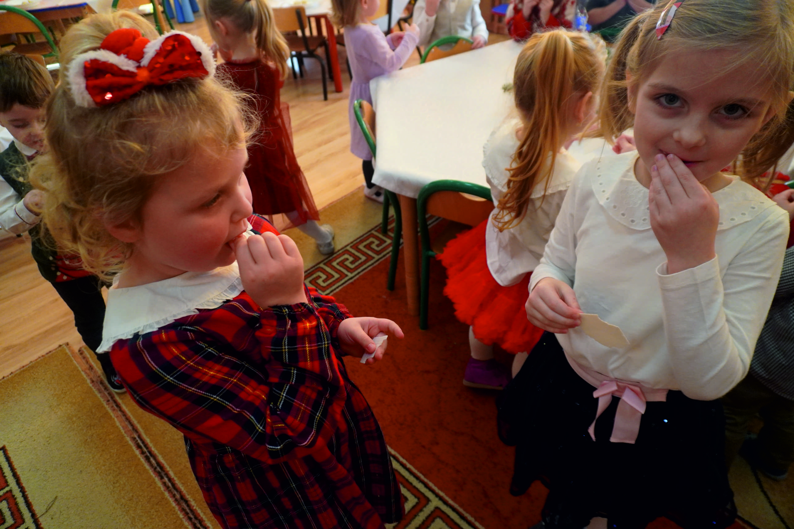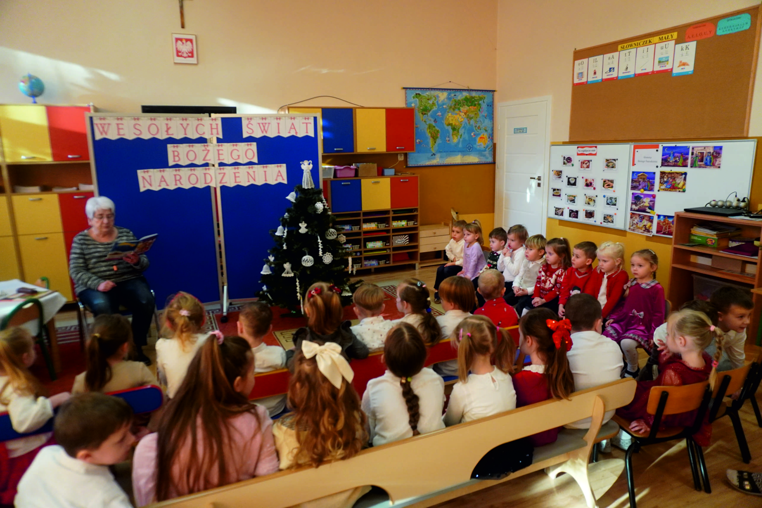 W salach i na korytarzach panowała świąteczna atmosfera… Choinki były pięknie przystrojone, a w powietrzu unosił się zapach pierniczków… Dzieci razem z nauczycielkami przygotowały dekoracje, które dodały spotkaniu uroku i ciepła.