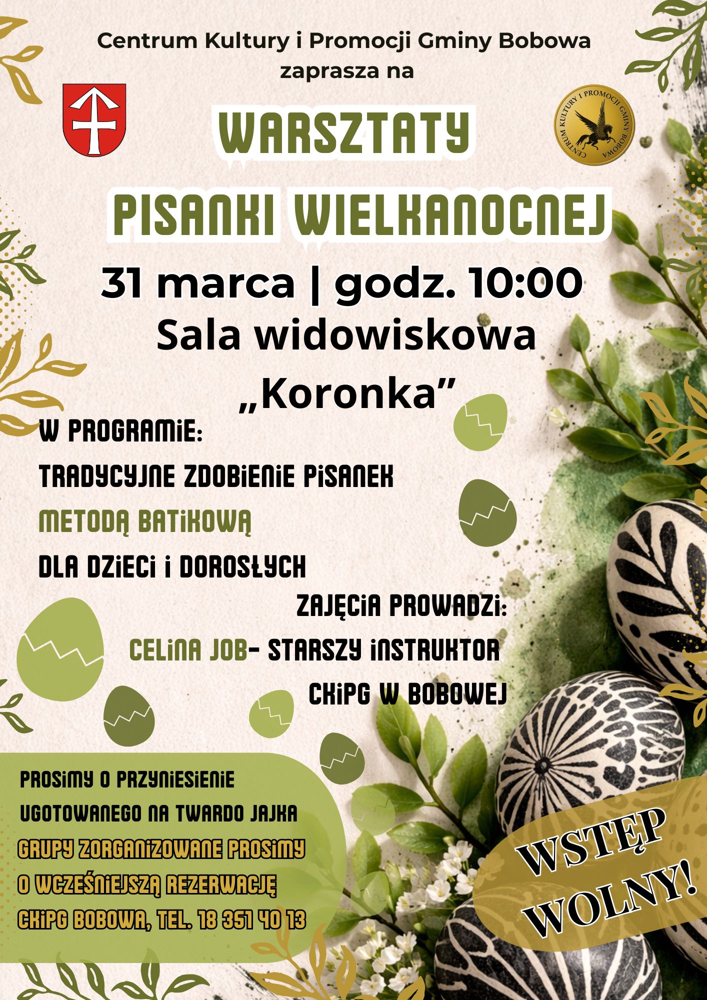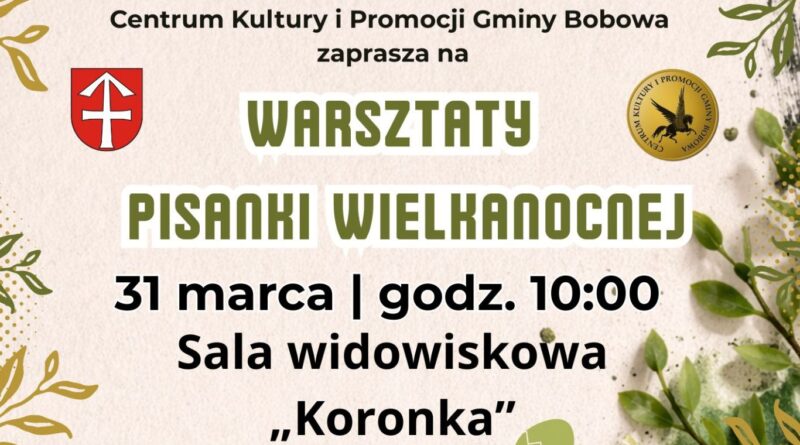 Burmistrz Bobowej, Centrum Kultury i Promocji Gminy Bobowa zapraszają do udziału w warsztatach tworzenia pisanek wielkanocnych, podczas których uczestnicy będą mieli okazję poznać tradycyjne techniki zdobienia jaj oraz samodzielnie wykonać własne pisanki.